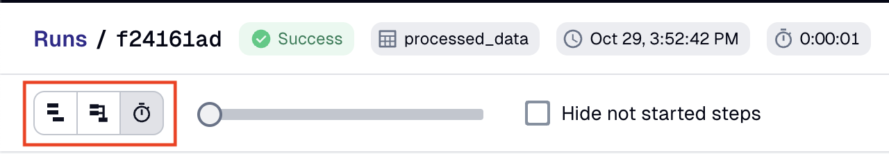 To view the run as it executes, click the Runs tab, then on the right side of the page, click View:  To change how the run is displayed, you can use the view buttons in the top left corner of the page: